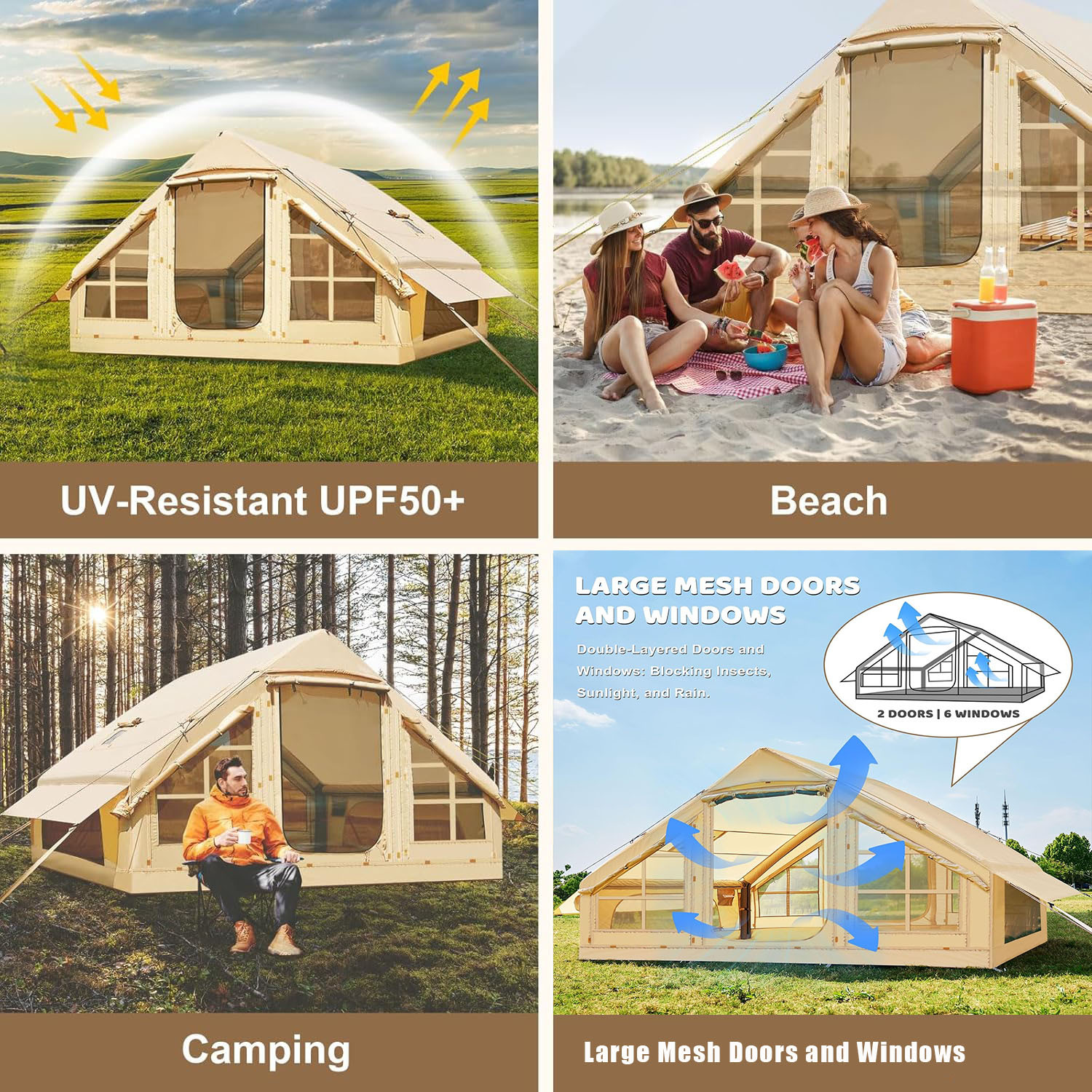 Inflatable Camping Tents With Hand Pump. Air Glamping Tents. Easy Setup WaterprootAnd Windproof Blow Up Tent. 4 Seasons Oxford Cabin Tent With Mesh & ChimneyWindow.